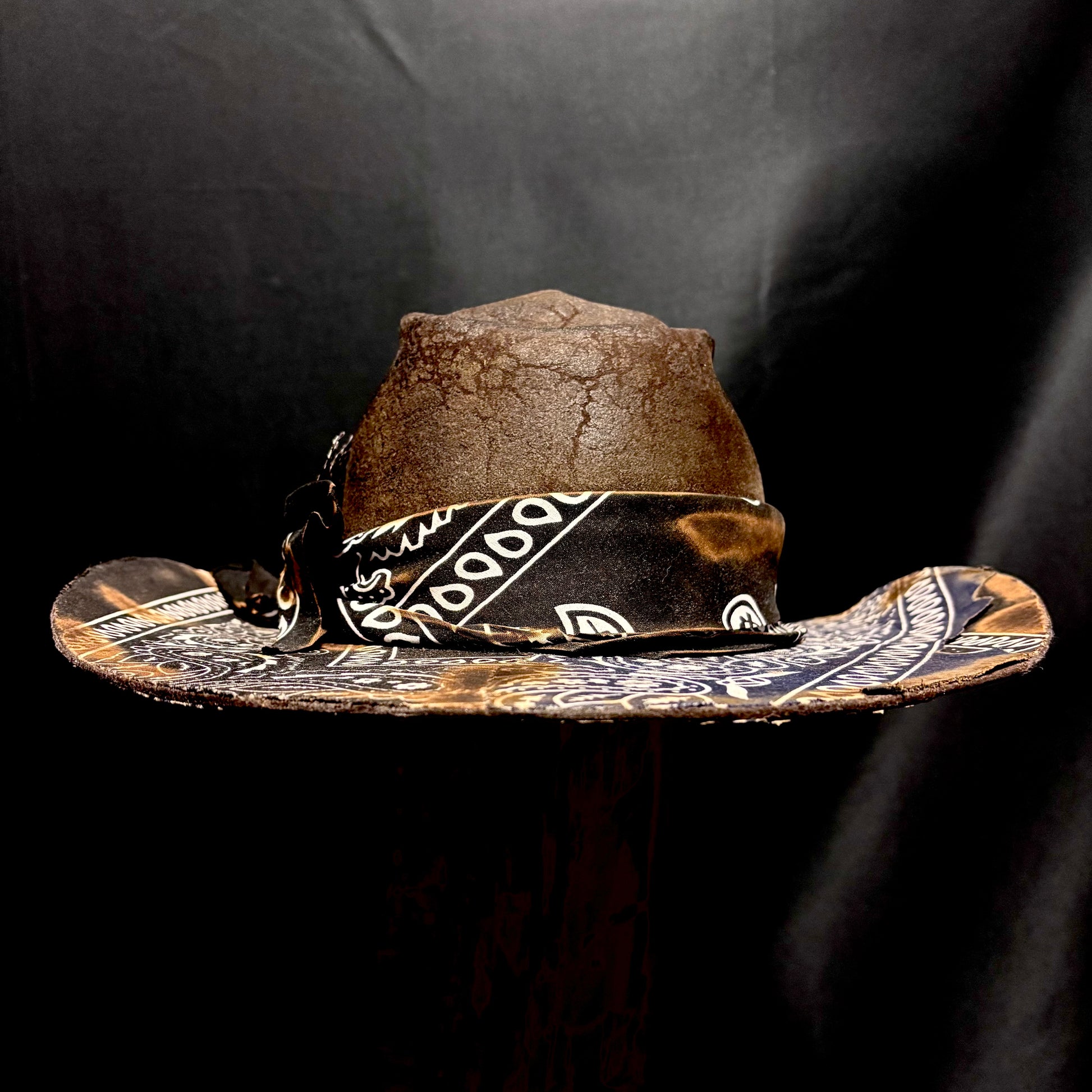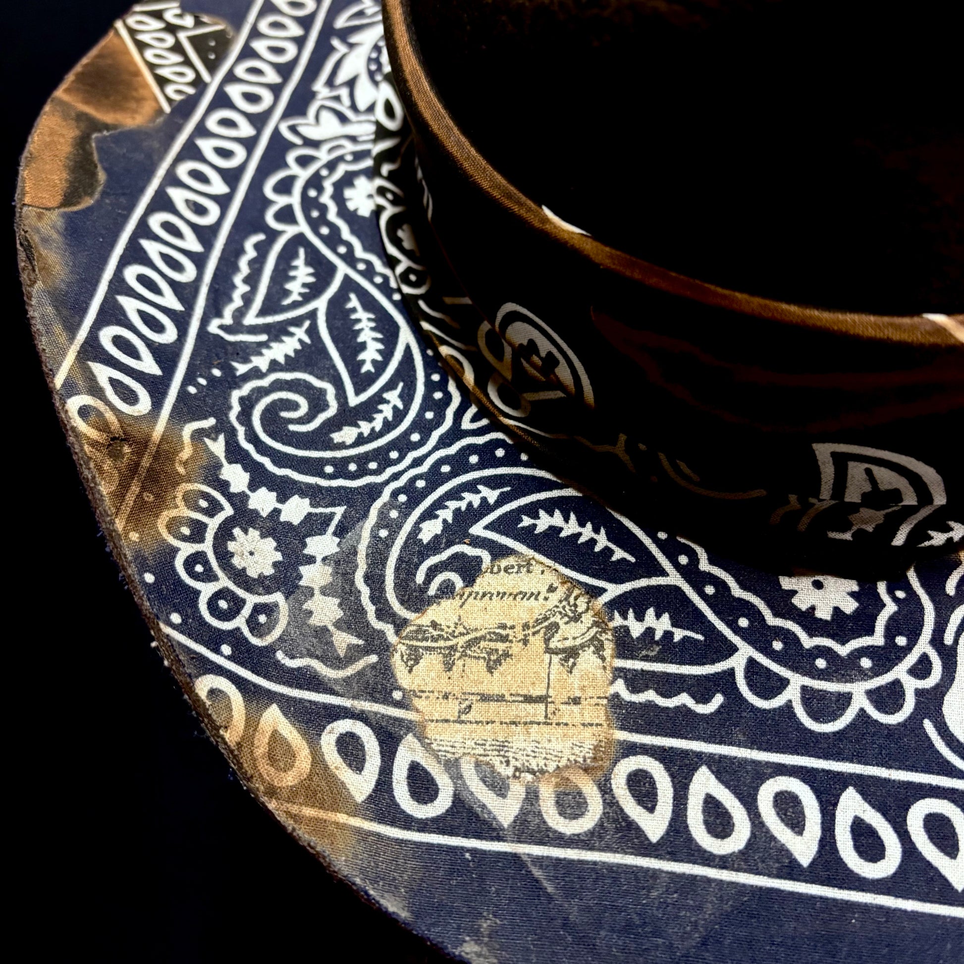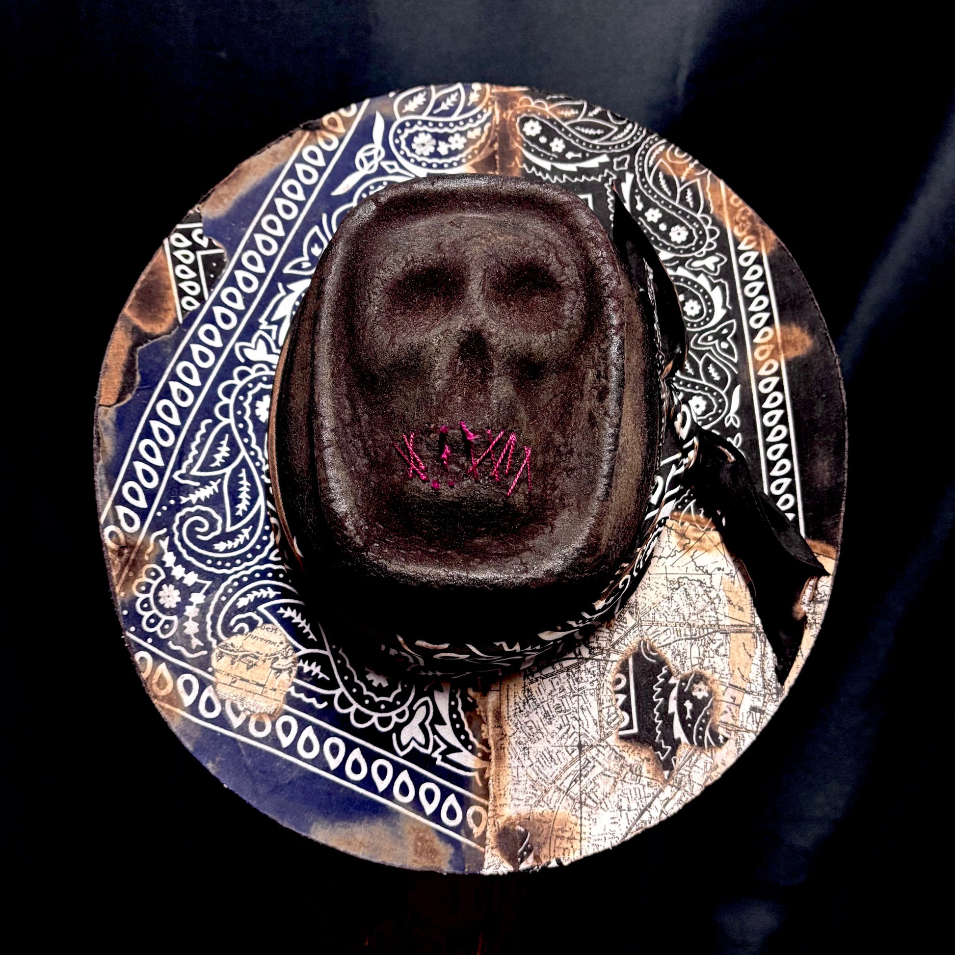 Skull crown, unforgettable paisley, aged to crisp perfection, this hats got it all. There’s even treasure map placed into the brim. Wide gunslinger brim with a brick crown, an instantly recognizable shape. This poor soul had their mouth sewn shut, what for? Just tell us your size, maybe they’ll tell you.
