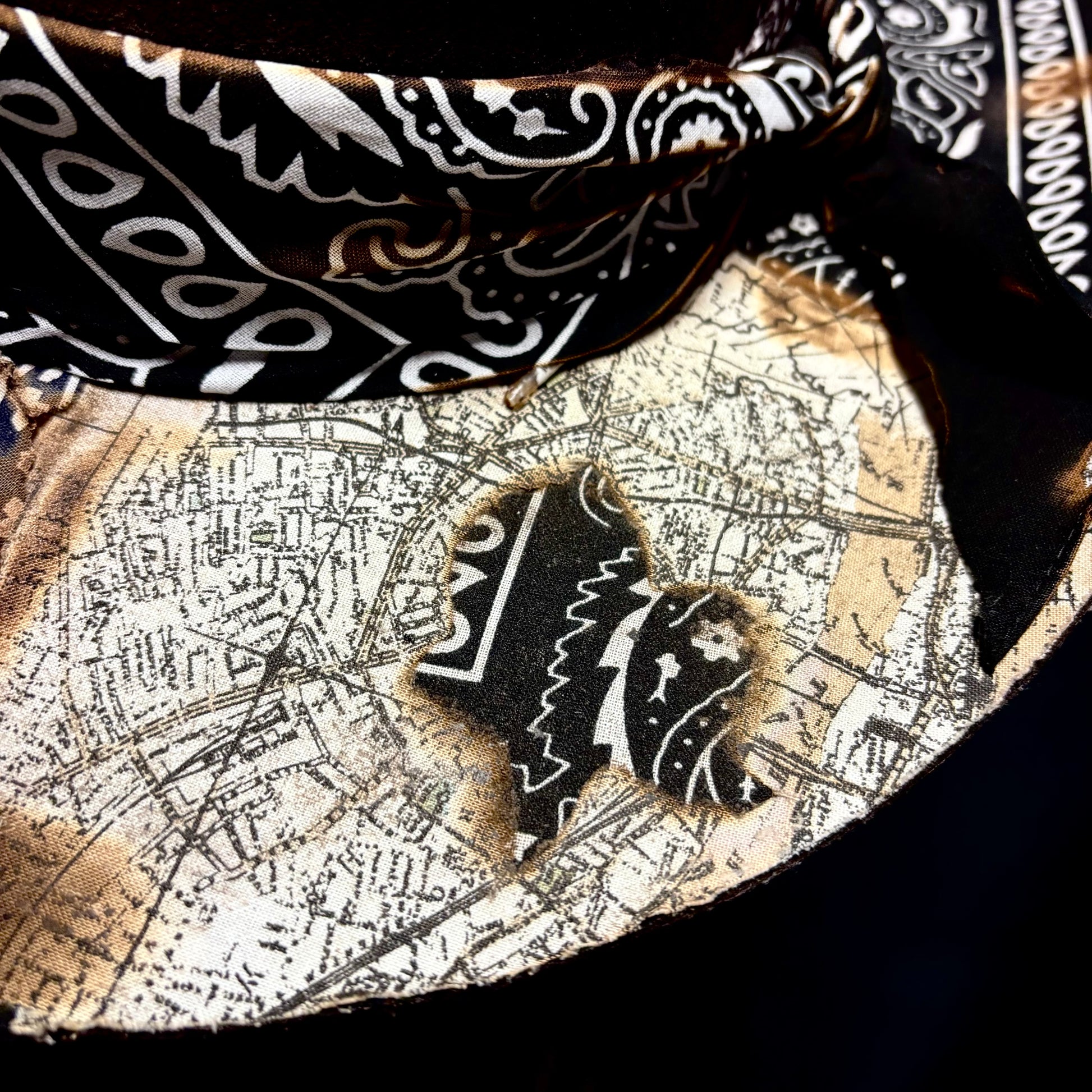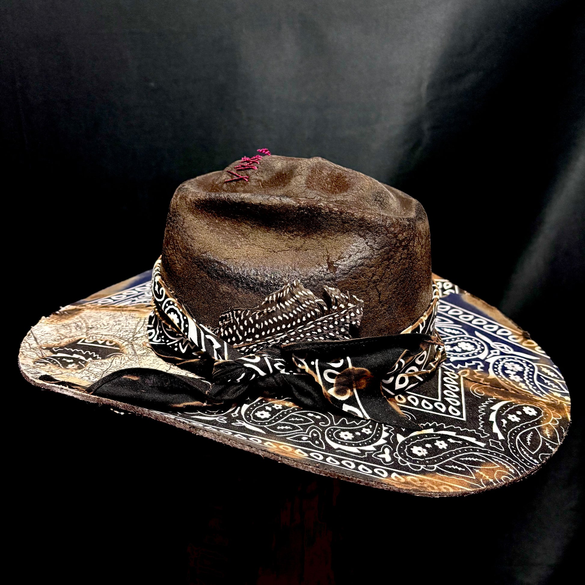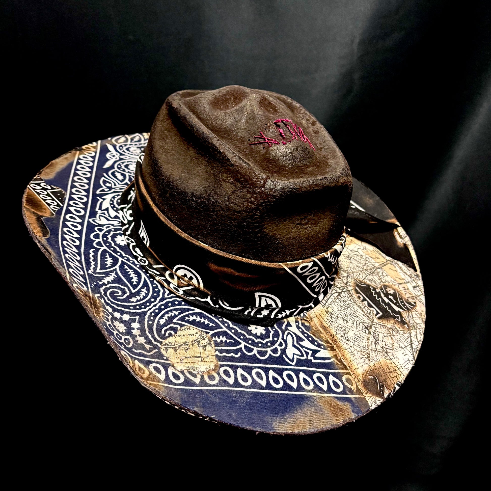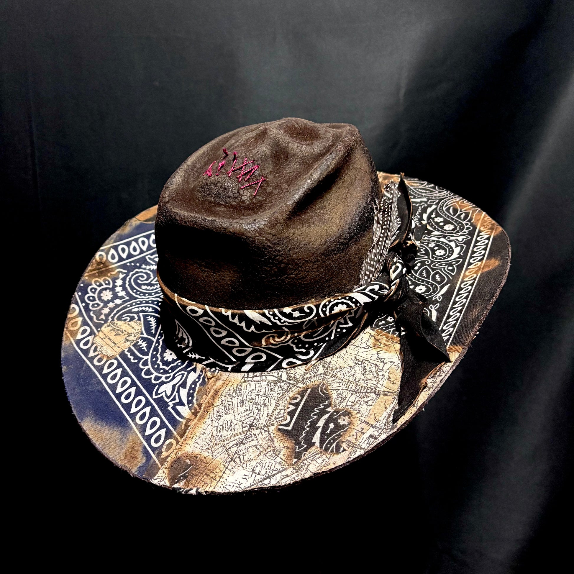Skull crown, unforgettable paisley, aged to crisp perfection, this hats got it all. There’s even treasure map placed into the brim. Wide gunslinger brim with a brick crown, an instantly recognizable shape. This poor soul had their mouth sewn shut, what for? Just tell us your size, maybe they’ll tell you.